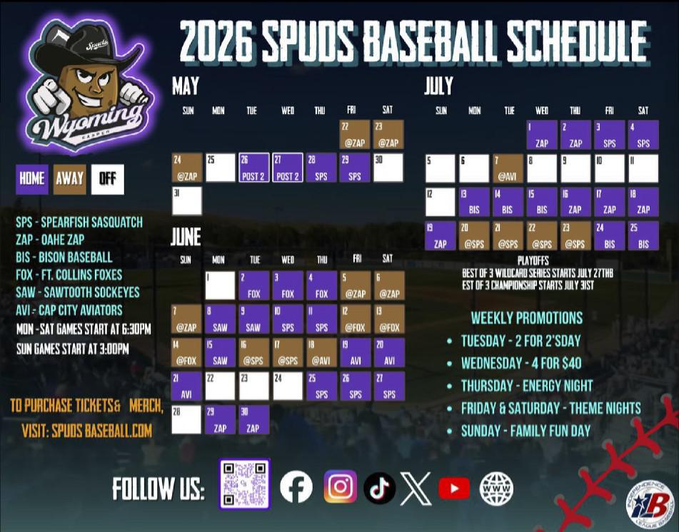 The Wyoming Spuds 2026 season runs from May 22 through July 25, followed by postseason play beginning July 27. All regular season home games are played in Casper.